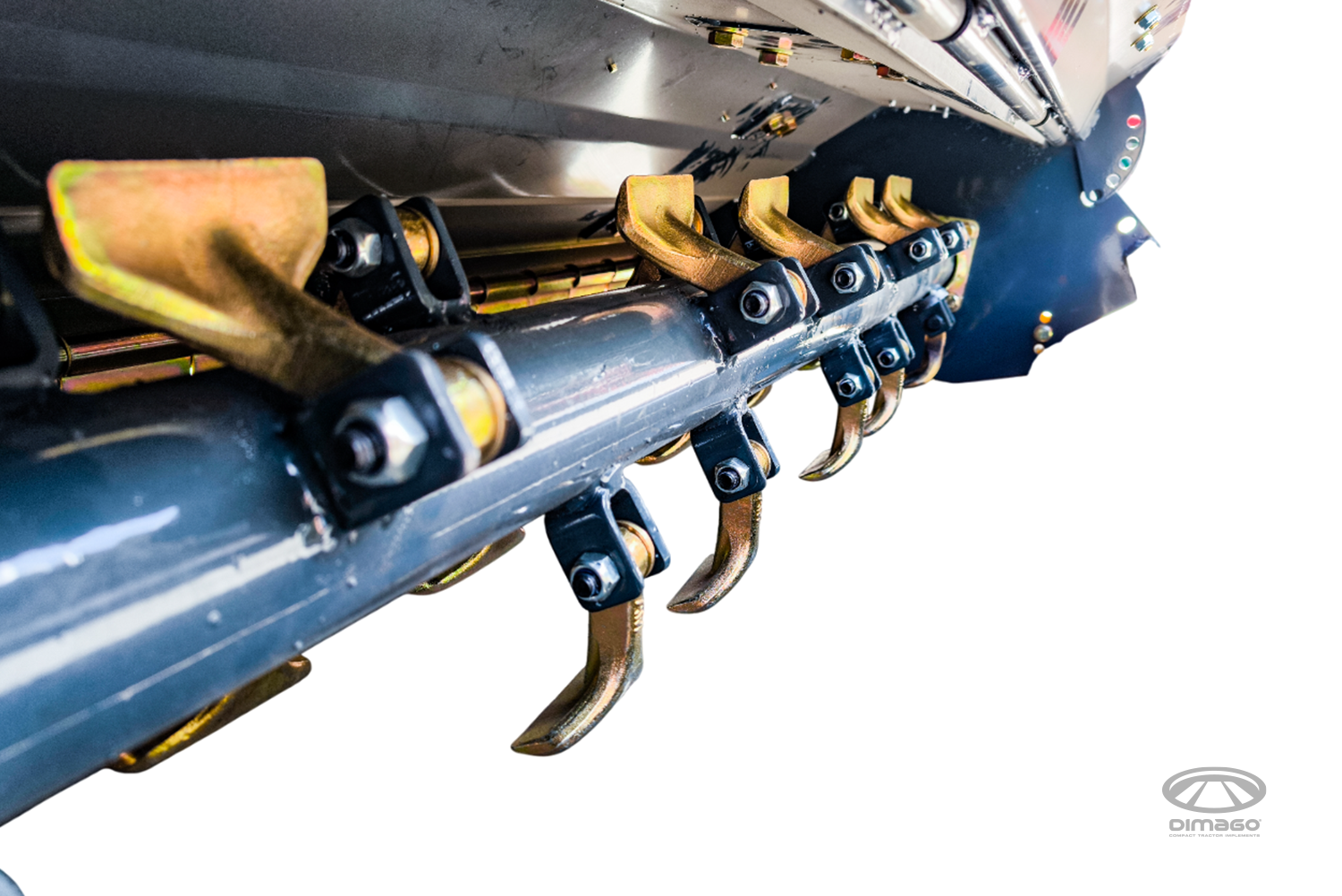 Grupo con rueda libre interna, un sistema de seguridad que protege la transmisión ante posibles obstrucciones o atascos, evitando roturas y reduciendo el mantenimiento. Este mecanismo garantiza un funcionamiento continuo y eficiente, incluso en terrenos duros o con restos vegetales. Además, los patines y el rodillo trasero regulables en altura permiten ajustar la profundidad y el acabado del trabajo con gran precisión, adaptándose a distintos tipos de suelo y necesidades agrícolas.
